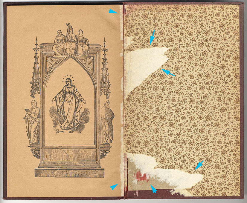 Bibliothekszettel auf vorderem Vorsatz, Bibliotheksstempel auf Titel. Hinterer fliegender Vorsatz ausgerissen, zum Teil auch hintererSpiegel beschädigt (siehe Abb.). Papier innen qualitätsbedingt gebräunt – ansonsten in sehr sauberer, ordentlicher Erhaltung.